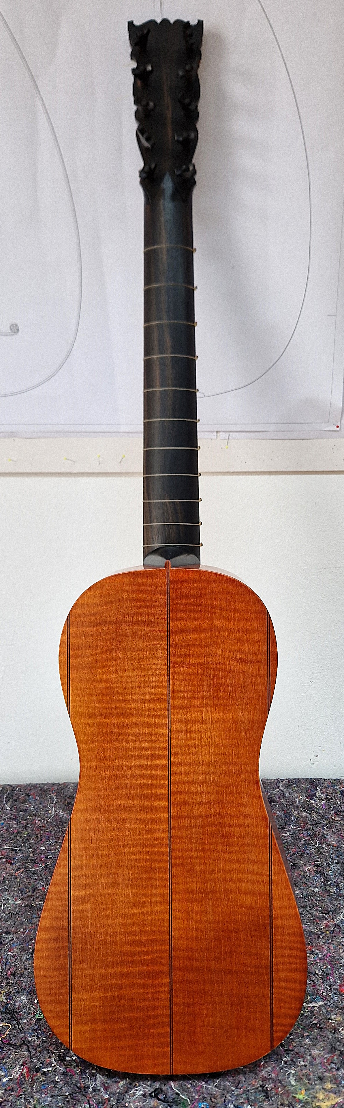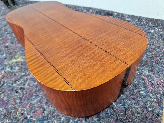 Korpus aus Riegel- oder Vogelaugenahorn, indischem Palisander oder nach individuellen Kundenwünschen mit und ohne Adern