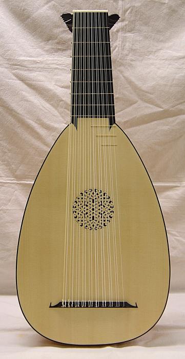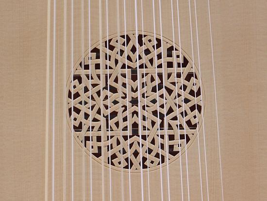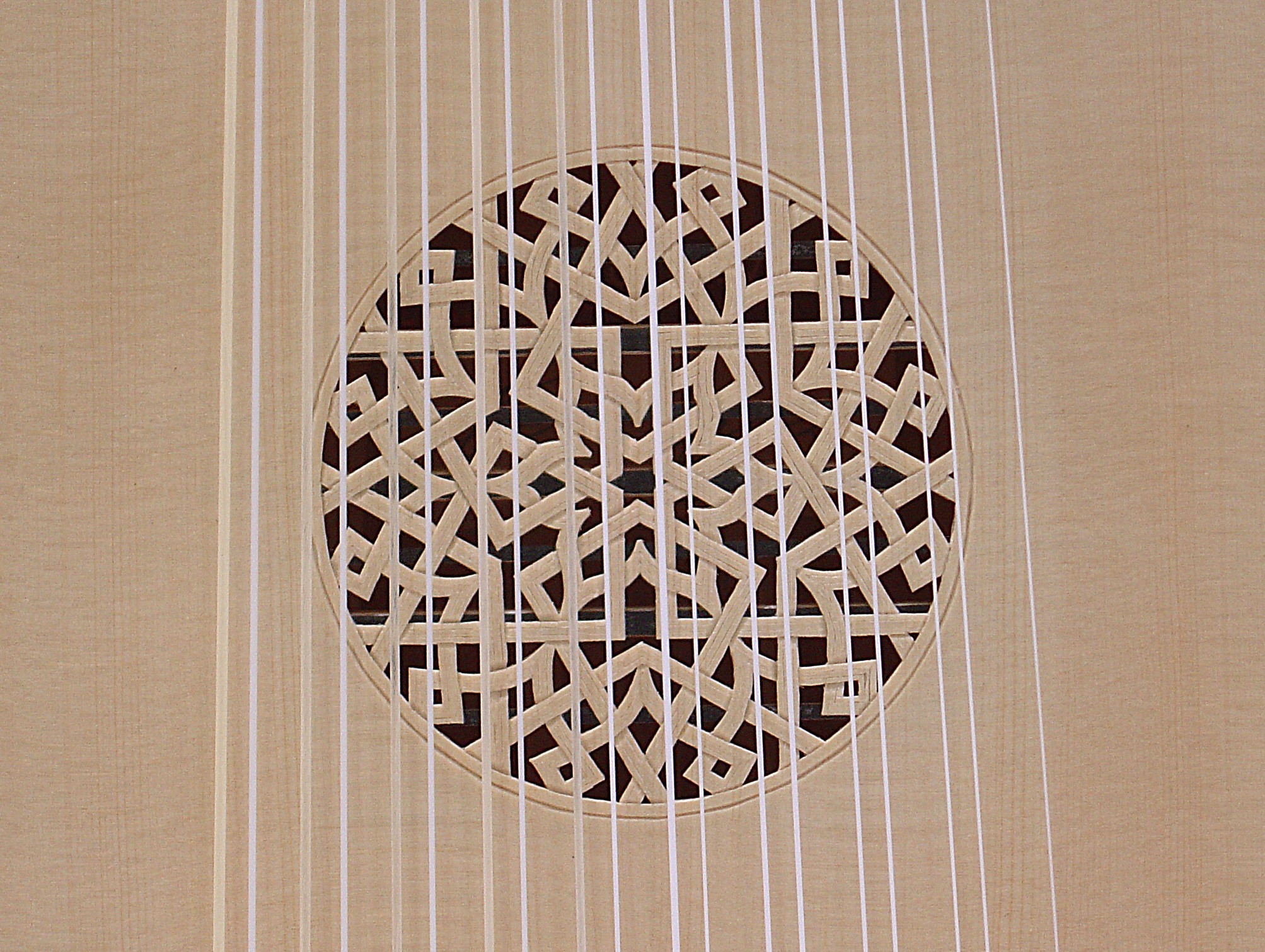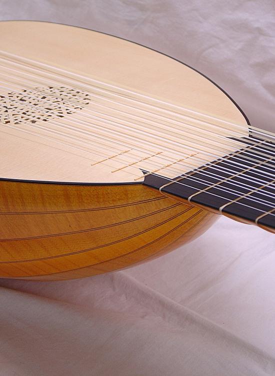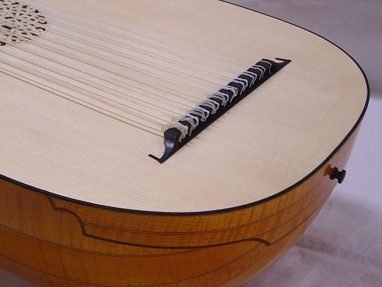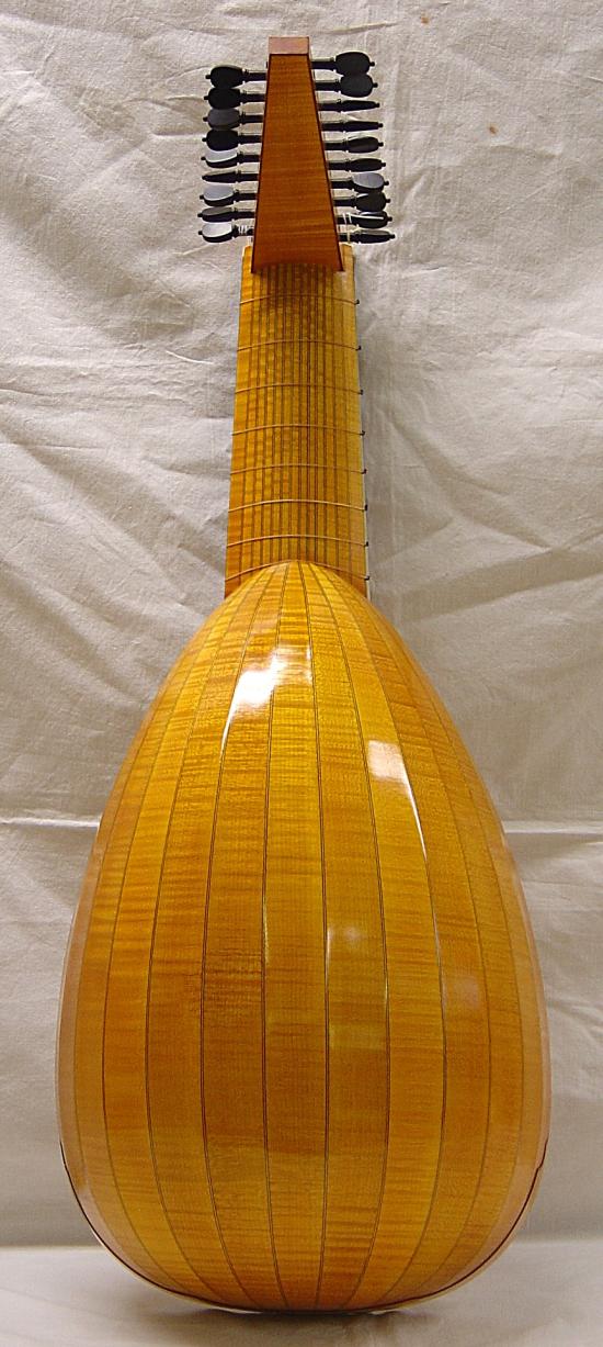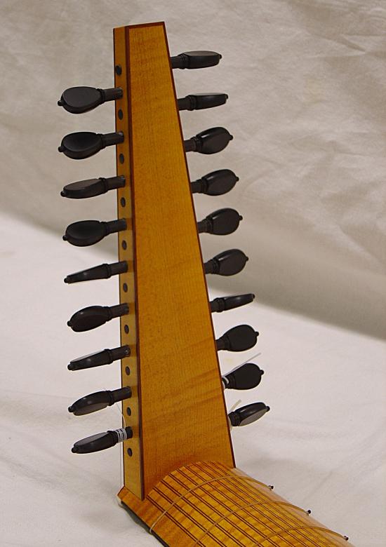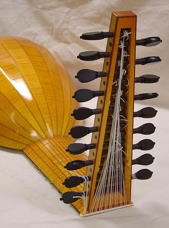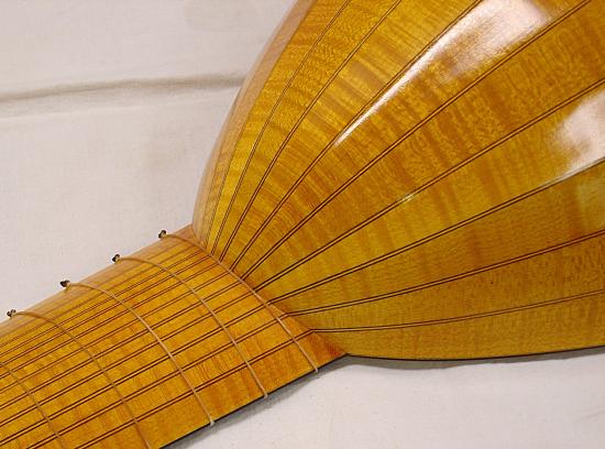 Hals und Wirbelbrett mit Riegelahorn furniert und Adern aus Nussbaum