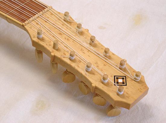 Hals aus Vogelaugenahorn mit furniertem Wirbelbrett und Einlegearbeiten