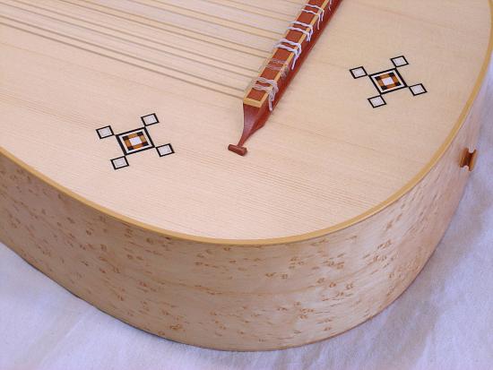 Korpus aus Riegel- oder Vogelaugenahorn, Elsbeere, Zwetschken(Pflaumen)-, Walnuss-, Kirschholz oder nach individuellen Kundenwünschen mit und ohne Adern