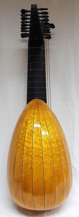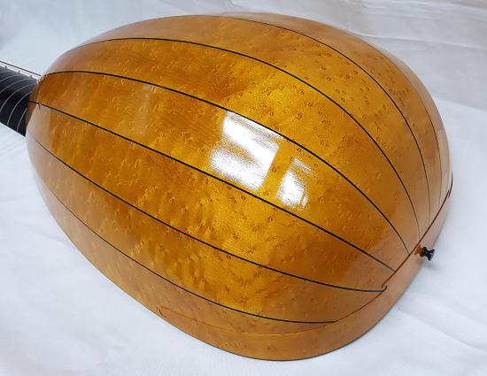body with 11 ribs in curly or birds-eye maple, plum, indian rosewood or according to individual customer preferences with or without purfling