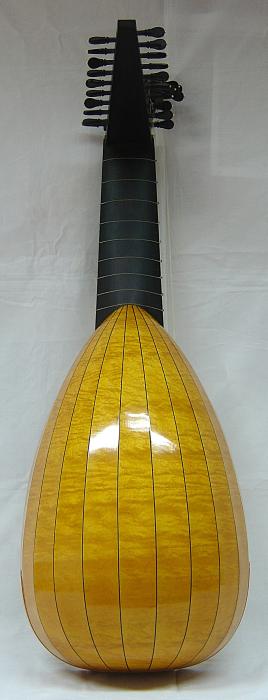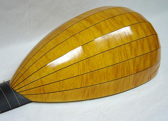 body with 11 ribs in curly or birds-eye maple, plum, indian rosewood or according to individual customer preferences with or without purfling