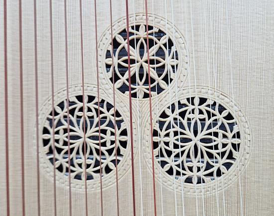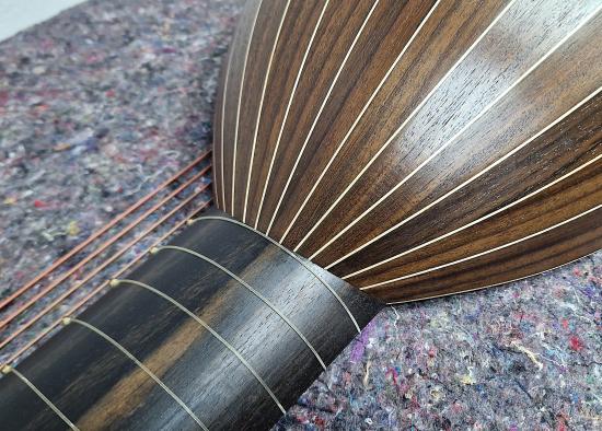 body with 13 ribs in curly or birds-eye maple, indian rosewood, plum, yew, ebony or according to individual customer preferences with or without purfling